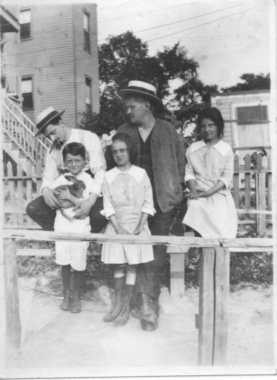 This is taken in the garden behind Delfino and Erminia's (my grandfather's sister) house in Jersey City. Shown is Delfino, my father, Henry (holding a rabbit), Tessie, my father and aunt's first cousin (mother of our cousins Terry and Jeannie Lagomarsino), my grandfather, Felice, and our Aunt Betty (Elizabeth Ferrero). The girls are wearing identical dresses- I originally thought that the younger may have been my father and aunt's sister, Marcelle, who died young- but nobody seemed to know exactly when. (The age of 6 was passed around) I will try to get that info from Calvary Cemetery. |