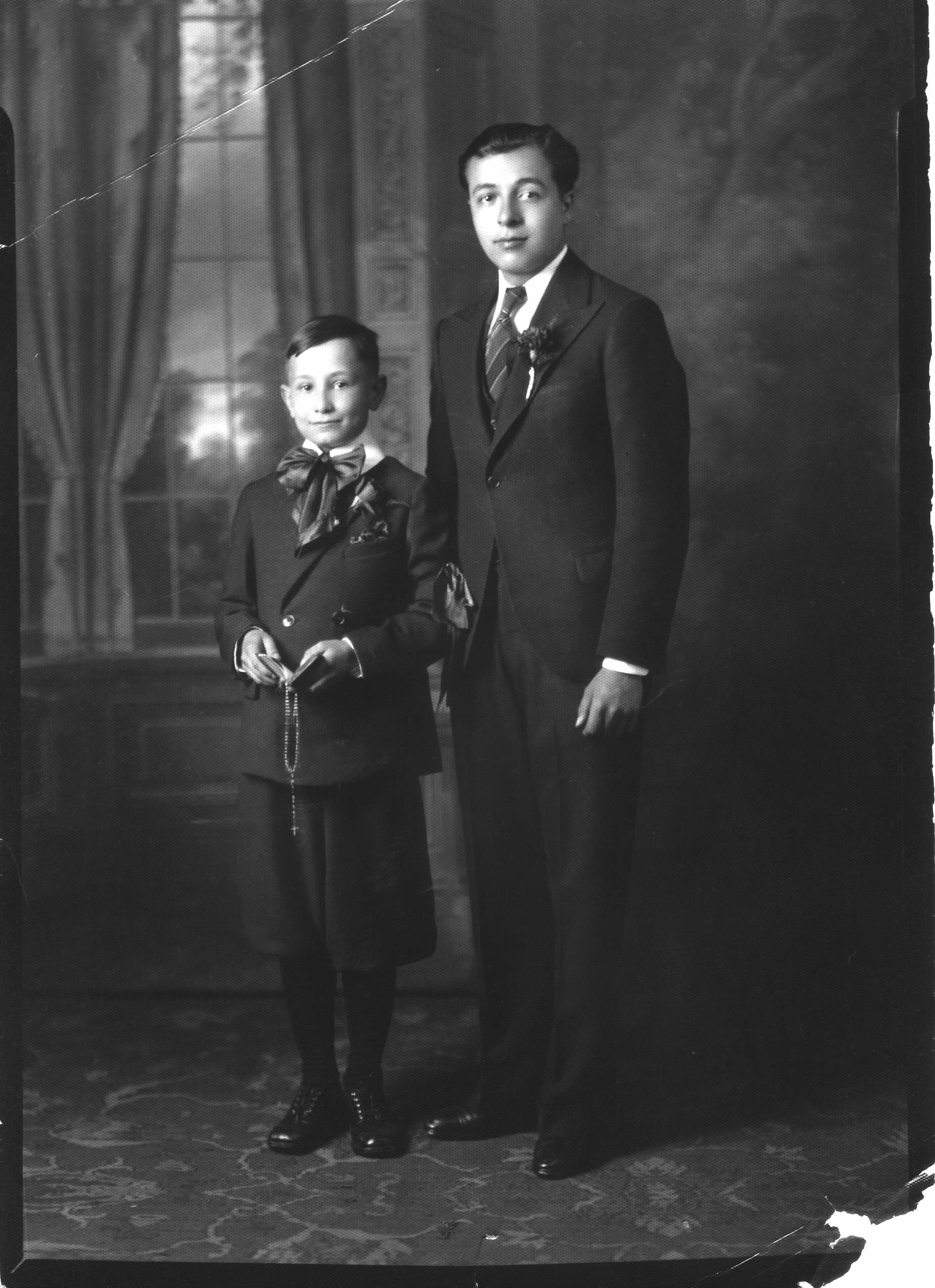 A young Louis and an also young Nino Pacchiana at Louis's Confirmation ceremony. The Pacchianas and Bugliolis were from adjoining villages in Italy, albiet there was a mountain between them. The Pacchianas were from Villa Morosco in Pecorara, Piacenza; next door to Casa dei Fracchioni. In another area of this program there is two photos taken from the deck of the main Fracchioni residence in 1910, and another taken by me in 2013 during our visit. The village in the far-ground is Villa Morosco. In Italy the two families asked many favors of each other, especially if someone was taking a trip to the U.S. That usually was transporting money.