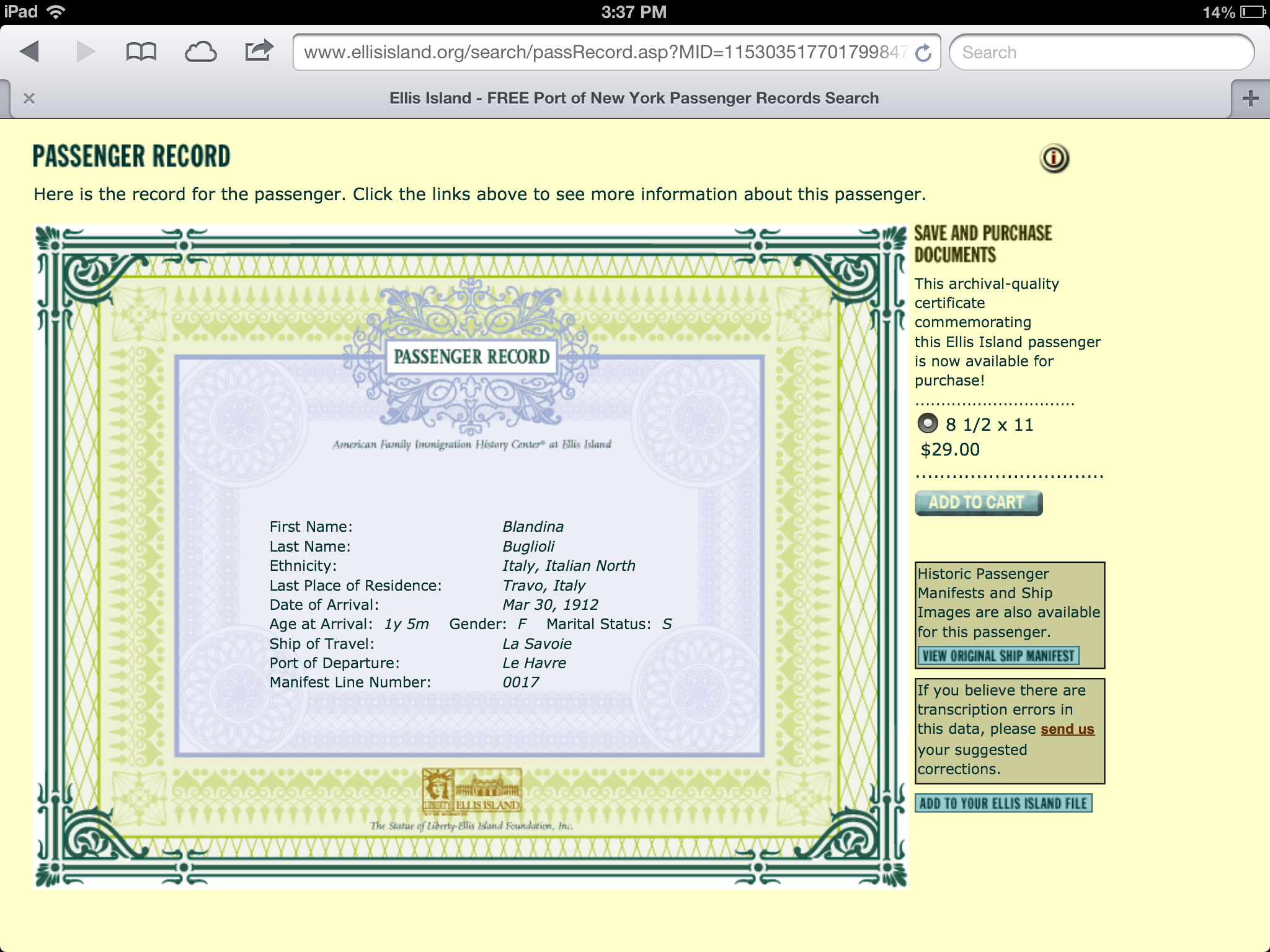 The Buglioli Family Portrait. Around him clockwise from the right: Carolina, Paul, Enis, Louis (Romeo), Mary, and Blandina (Lena). The picture was taken around 1925. Giuseppe Buglioli married Carolina Fracchioni on September 26th, 1909. Their marriage certificate was issued in the U.S. at Chiesa di St. Lucia [St. Lucy's Church] on W. 104th St, Manhattan. Other notable items from the certificate are Giuseppe’s parents listed as Luigi Buglioli and “Blandina” Achilli. Carolina's parents were listed as Giuseppe Fracchioni and Luisa Ferri. Some past reference to Carolina being a “wet nurse” in Italy suggests she may have gone back pregnant. As customary in Italy, the wife goes to the husbands' family to have the children. After this stay, for whatever reason, she returned with Lena in 1912. We have located a manifest and documentation from Ellis Island showing Carolina [listed as Fracchini-Buglioli, age 22] and Blandina [age 1yr, 5mo] arriving on the ship La Savoie out of Le Havre, France on March 30, 1912. See Carolina's Ellis Island Documentation, Blandina's Documentation, and the ship's Manifest for both Carolina and Blandina [lines 16-17] which also gives Giuseppe's address on E.106th St. No other references to related Buglioli's still residing in Italy found as of this date – February 2014.
