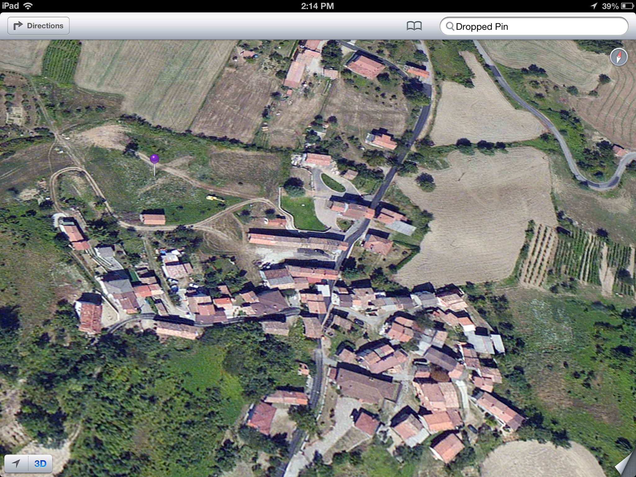 This is a satellite photo from Google Earth of Casa dei Fracchioni as it is today. While on our visit, the photos we took will show the narrow entrance visible at the center See photo, a few buildings from the top, and where we turned after driving through the village at the very bottom -there's a gate to someone's property See photo. Note: it was a four point turn as there was a drop-off to the right of the road. Simona [Fracchioni] and Alberto Edossi live obliquely across and down from the long grain building on the left side of the road. See more photos from “Families Menu”