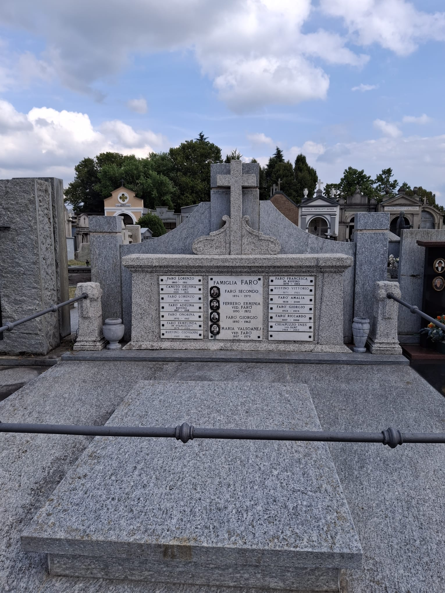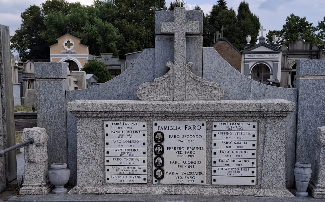 My brother and I grew up assuming that Secondo Faro and Erminia were not a couple and that Faro [as we called him] was a family friend from Italy. It was brought to my attention in September of 2025 that they wed sometime after Delfino died on February 15th, 1946. Erminia Ferrero Gaido Faro and Secondo moved back to Giaveno and Secondo died in 1970 and Erminia in 1972. The Faro family was fairly large. You can see the Giaveno cemetery plot where my grandfather's sister is buried: Faro Family Memorial; Names on grave |