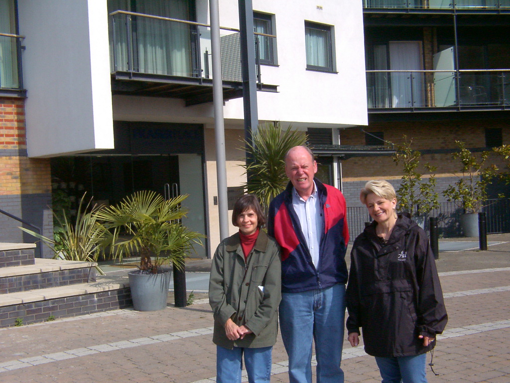 I guess this was my [60th] birthday present from all. Tickets for our trip to England. Well it seems like yesterday. I'm taking the picture of Aurora, Henry and Linda in front of our Flat located on Canary Wharf. Looking across at the new Financial District. It was a beautiful spot. The were building the Olympic Stadium a few blocks up-hill from us. We were in London for a week and then ventured north via the “Flying Scotsman” which is the newer version of the train that our grandfather Saunderson was a Fireman on. Nope- not that kind! He shoveled coal into the Steam engine from the second car that had the coal in it. The purpose of the trip was to see London, but more-so to visit with our ten cousins and two great aunts. The next few pages will have some; but not enough explanation. These people were so welcoming to us that we still keep in touch with letters around Christmas an the occasional Email. So all you Saunderson newbies, What you have as family is not only stateside- look across the pond. All these folks have many children who also are blood relatives to you. |