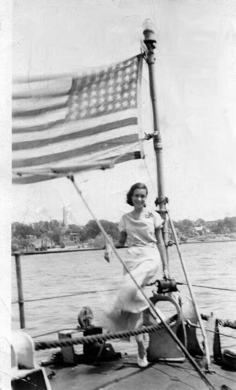My mother on the bow of a large boat. It was anchored, so it wasn't the Staten Island Ferry. ... Not a clue!...
